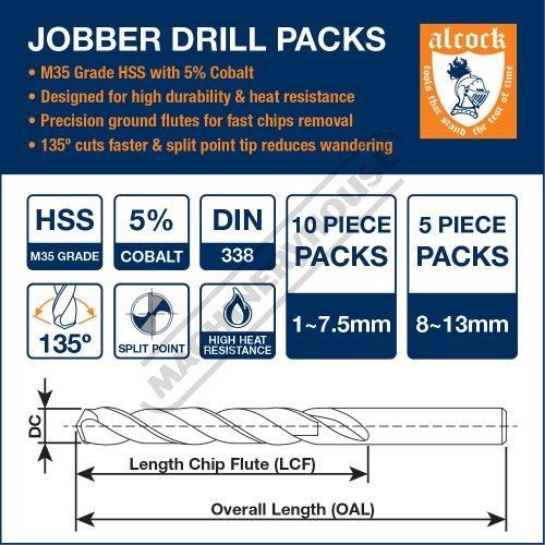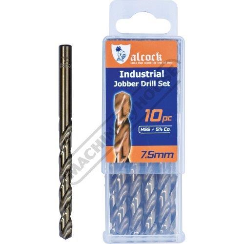 ALCOCK Ø7.5mm HSS Jobber Drill Pack - 10 Piece M35 Grade HSS with 5% Cobalt 135º Precision Ground Flute & Split Point