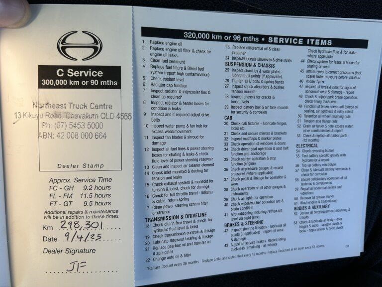 Body Measures 4600(L) x 2450(W) x 3300 (H). Fitted with 8 x Body Mounted Toolboxes, Pintle Hook, Air Trailer Brakes, Diff Locks, Hand Wash Station, Work lights, Amber Beacon Lights, 400L Fuel Tank, Sign Rack, Cone Holder, Vice, Battery Isolator, Driver Spring Seat, 6 Seater, Air Conditioning, CD Radio, Power Windows, 6 Speed Manual Transmission, 220HP Turbo Diesel Engine, Travelled 298,303km.
