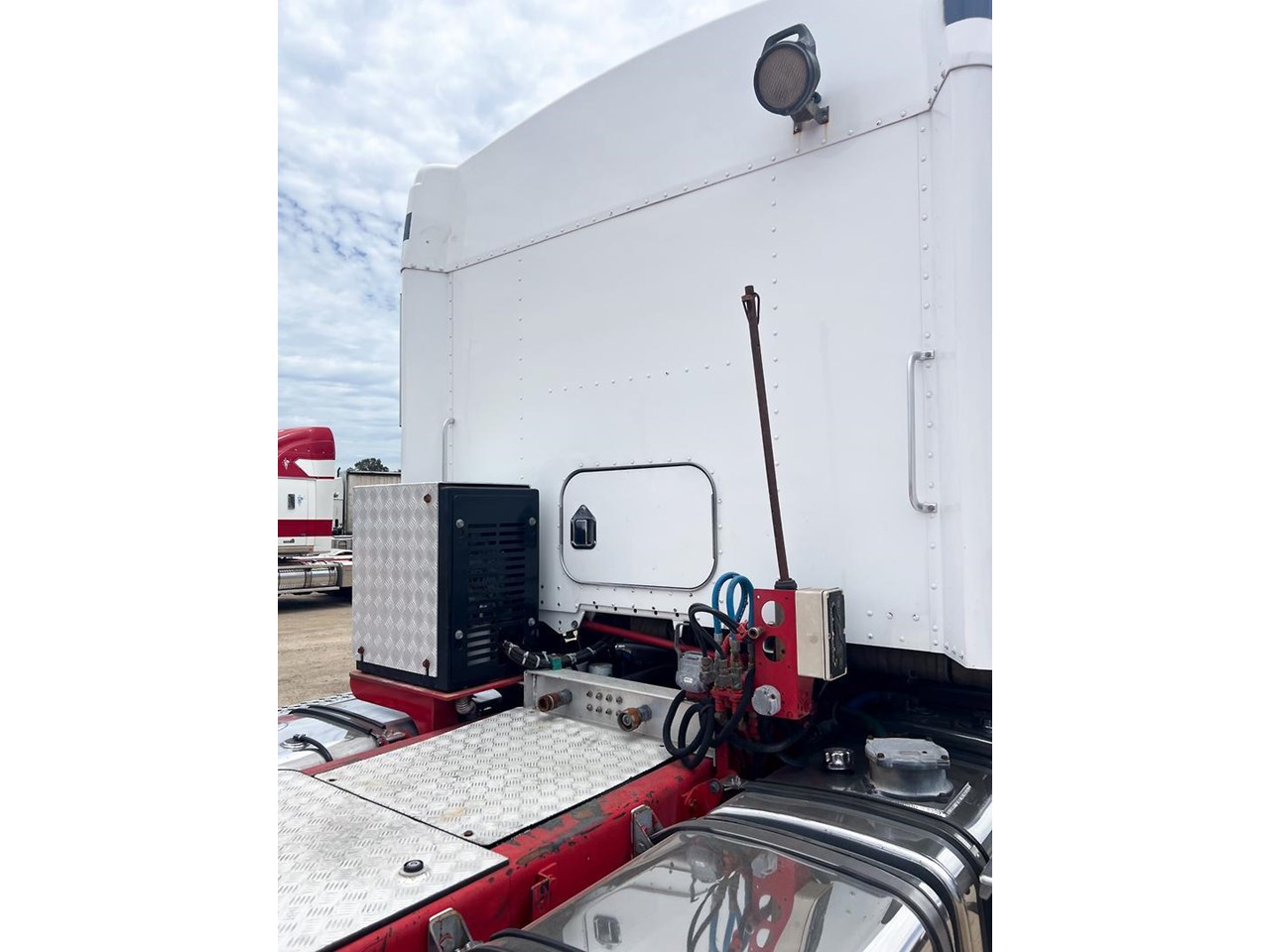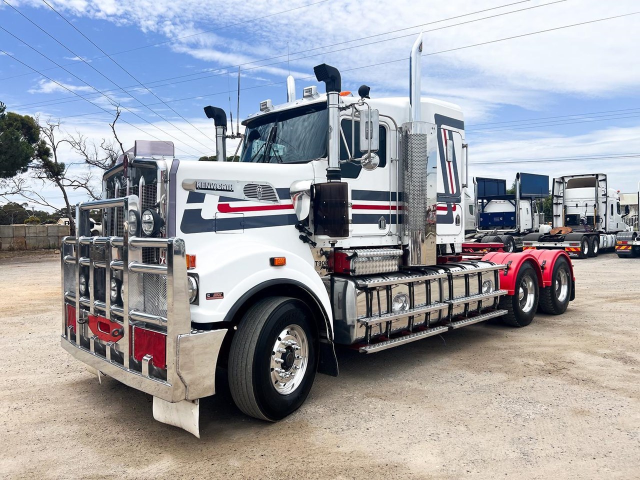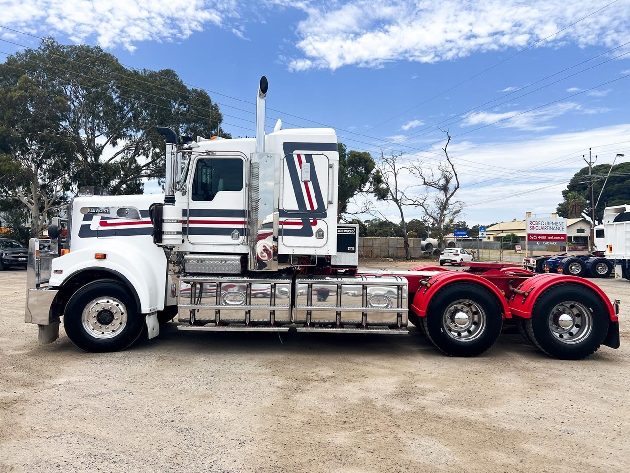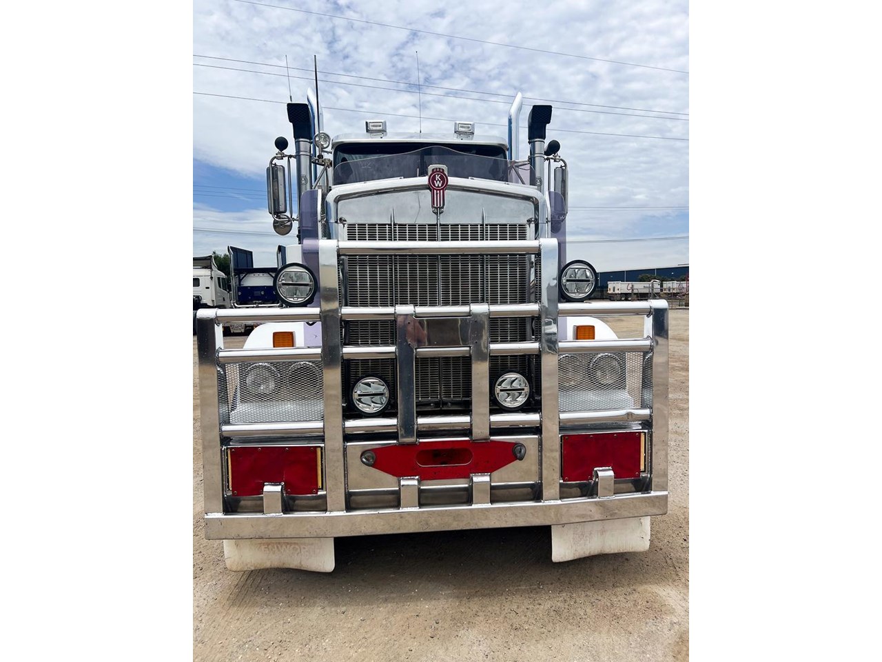 2009 Kenworth T908 6x4 Prime Mover,600 hp Cummins ISX EGR eng with 18 spd manual trans-RTL022918B-Dana RT52-190 Rear axle @ 4.56 on Kenworth KW6-60A 21T 6 rod spring susp,Alloy wheels and FUPS bull bar,Offsets on steer,36" low roof intergreated sleeper with Icepack-ES bunk air con,PTO hydraulics set up for end and side tippers,Diff and X Locks to both rear axles,2" fixed QRTT,Fuel tank on RHS converted to toolbox,Alloy water tank,Dolly pull in rear,Alloy walkplate,Rad/Cd, is a good spec heavy rated truck.