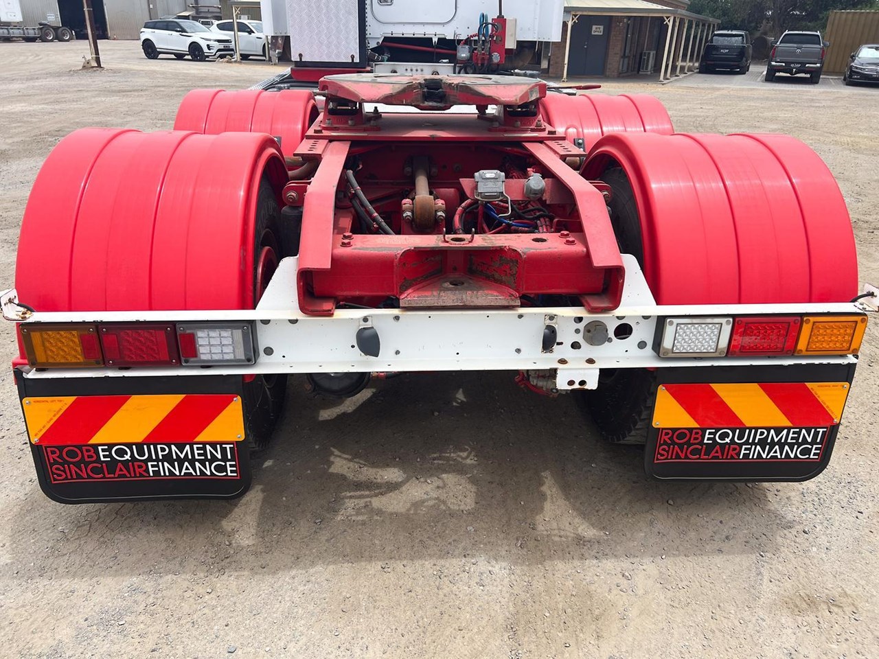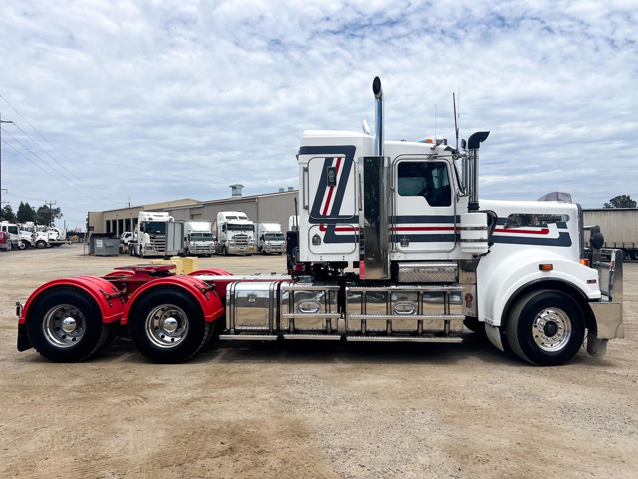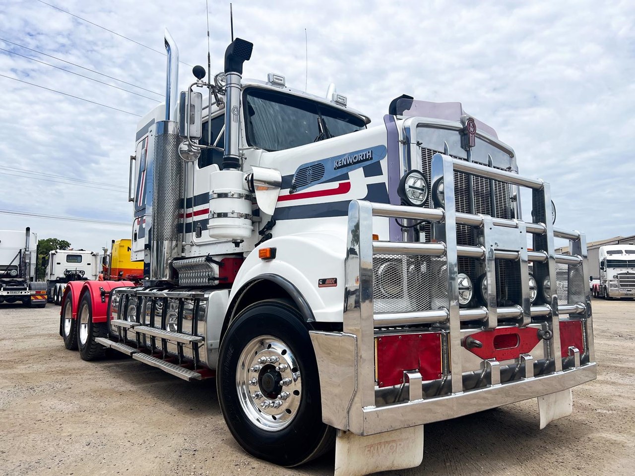 2009 Kenworth T908 6x4 Prime Mover,600 hp Cummins ISX EGR eng with 18 spd manual trans-RTL022918B-Dana RT52-190 Rear axle @ 4.56 on Kenworth KW6-60A 21T 6 rod spring susp,Alloy wheels and FUPS bull bar,Offsets on steer,36" low roof intergreated sleeper with Icepack-ES bunk air con,PTO hydraulics set up for end and side tippers,Diff and X Locks to both rear axles,2" fixed QRTT,Fuel tank on RHS converted to toolbox,Alloy water tank,Dolly pull in rear,Alloy walkplate,Rad/Cd, is a good spec heavy rated truck.