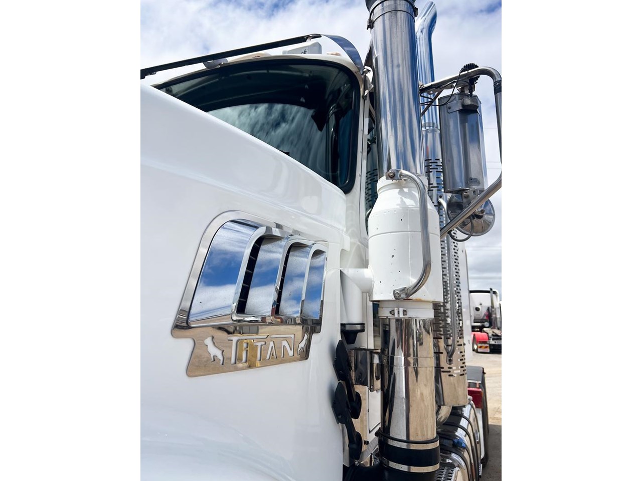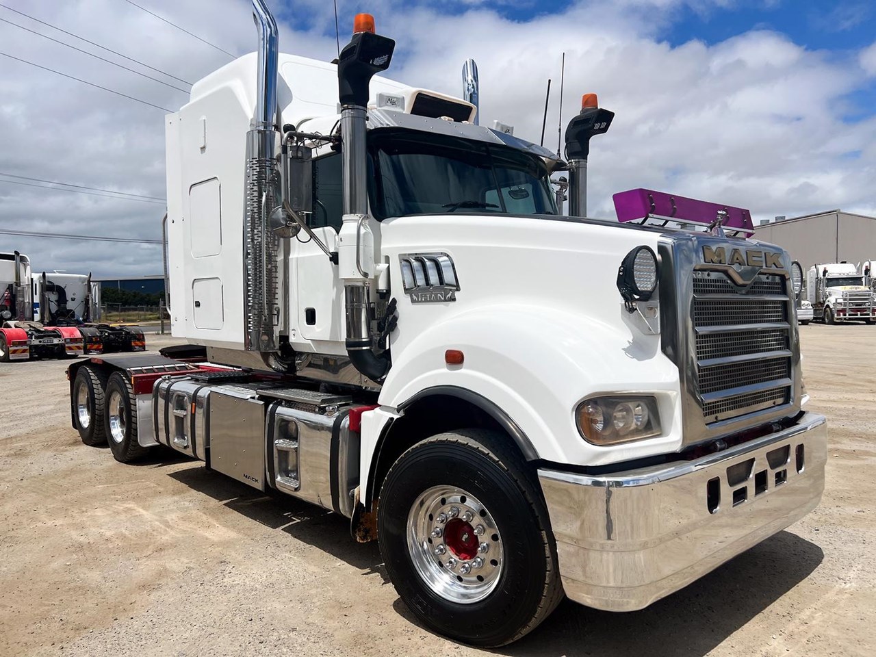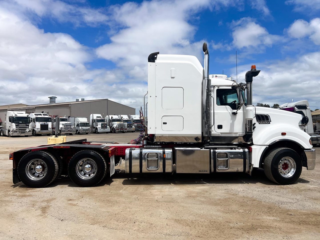2014 Mack Titan 6x4 Prime Mover.600 hp 16 ltr Mack MP10 eng-Has engine rebuild history- with 18 spd trans-RTL022918B-Meritor RT52-185 rear axles on Mack spring susp,Alloy FUPS bumper and wheels,Super singles on steer,64" high roof intergreated sleeper with Icepack-2000 bunk air con,Alloy water tank,Diff and rear axle x lock,Alloy water tank,Rubber drive gaurds,PTO Hydraulics for side tippers,Dolly pull in rear with air and electric fittings,RAD/CD,UHF,Rotating beacons,Roof mounted air con is a solid heavy rated truck.