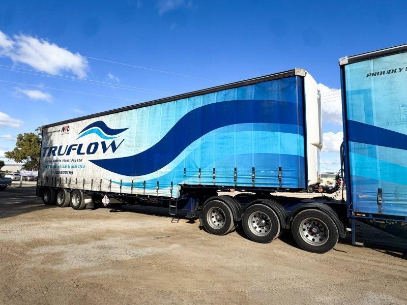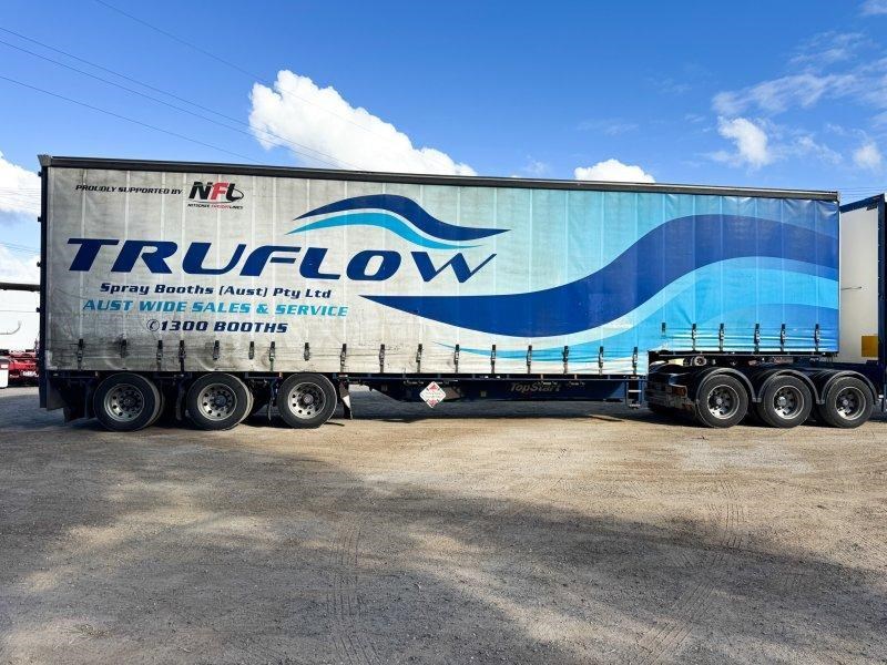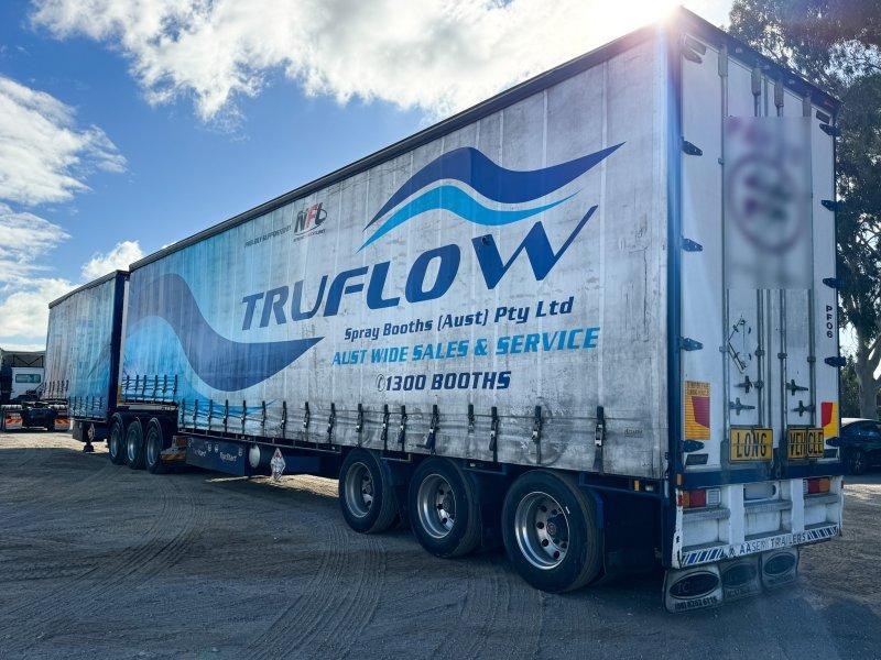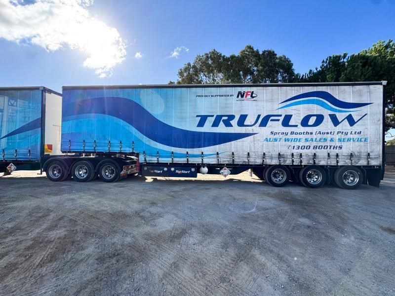 Complete B-Double curtain side set with mezz decks, well equipped for general freight and high-capacity distribution.